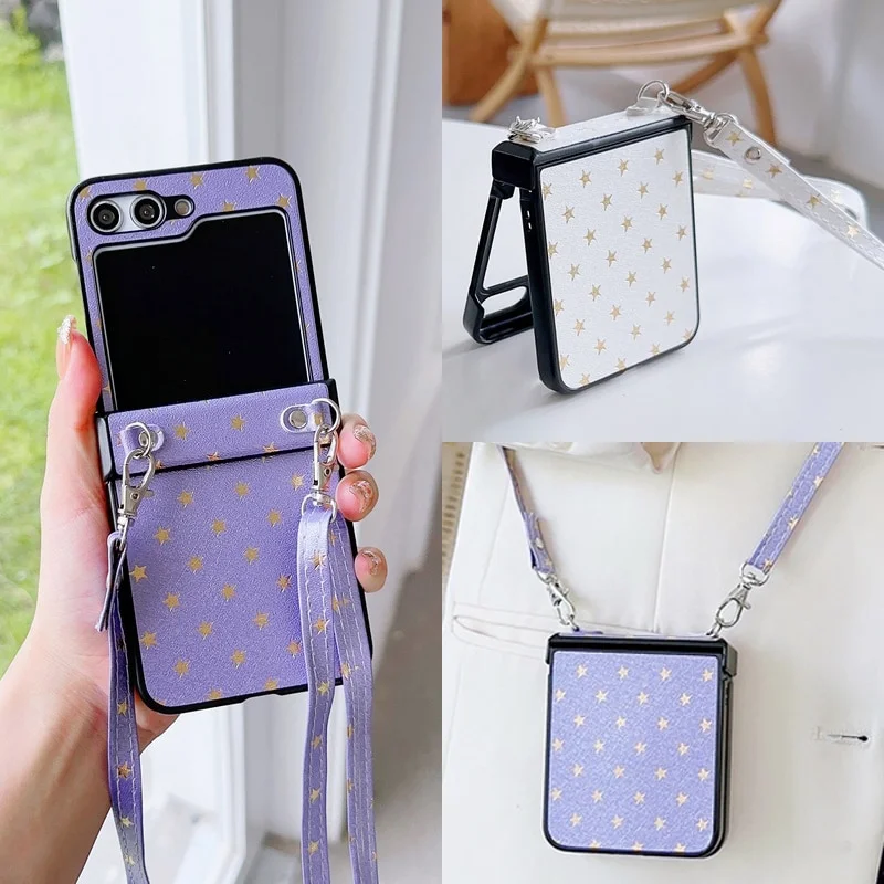 Crossbody Necklace Lanyard Stars Leather Case For Samsung Galaxy Z Flip5 Flip4 Flip3 5G Shockproof Soft Strap Back Cover Funda